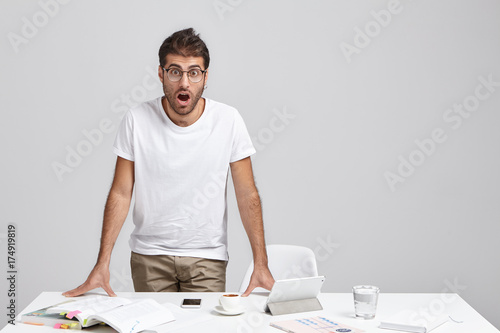 On no. Portrait of attractive bug eyed bearded dark haired male employee standing at his work desk with jaw dropped feeling terrified because he forgot about something. Human emotions, feelings