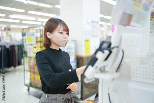 On November 10, 2024, a young woman in her 20s with short hair wearing a black knitted long-sleeved shirt is shopping at a self-checkout at a supermarket in Agui Town, Aichi Prefecture.