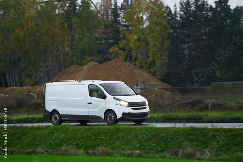 On the Delivery Route. Commercial Van Close-Up on the Road. Logistics branding. Commercial van on the road. Final destination shipping truck mock-up.