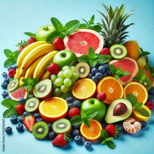 on the right Fresh fruits and mint on bright blue, on the left empty light blue isolated background
