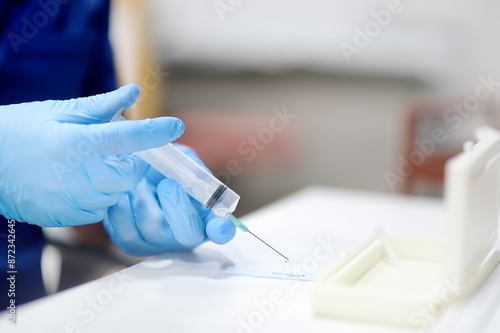 Oncologist performing a cancer biopsy test during the appointment of patient. The doctor applies a sample from a syringe to a slide.