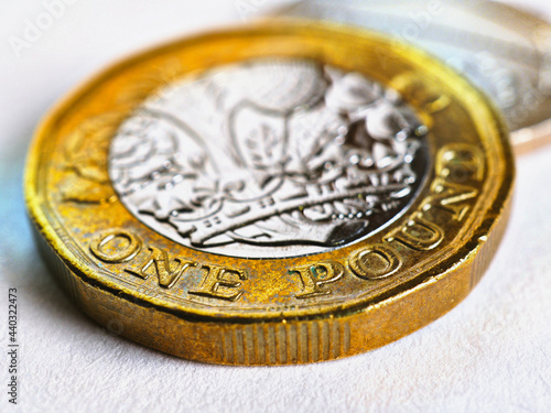 One British pound coin lies on a light white textured surface. Focus is on denomination of coin and name of currency of UK. Illustration about economy, money, finance in Great Britain. Brexit. Macro