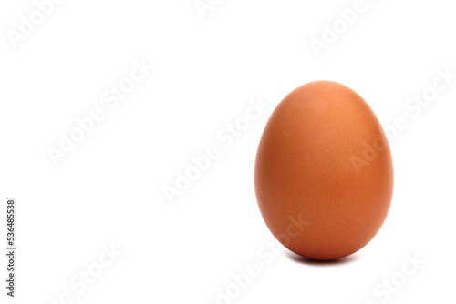 One chicken egg stands on a white background.