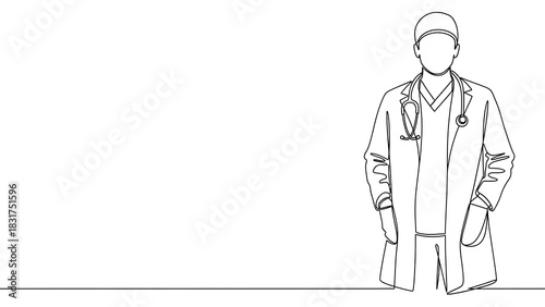 One continuous line art drawing of a doctor in medical uniform with stethoscope and cap standing. healthcare professional concept.