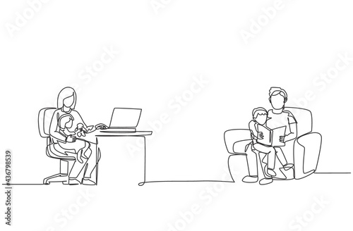 One continuous line drawing of young dad reading book to son and mother typing on laptop at home. Happy family parenting concept. Dynamic single line draw design vector illustration