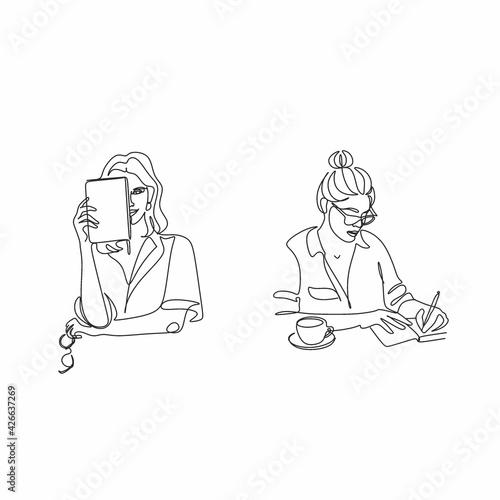 One continuous line drawing of young serious female worker sitting pensively while watching laptop screen at work desk. Business analyze concept. Single line draw graphic design vector illustration