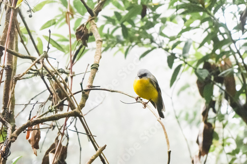 one eastern yellow robin Lamington National Park Queensland Australia small cute little wildlife mist