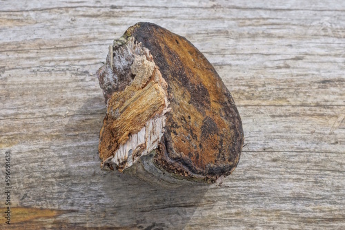 one large brown dry tree fungus chaga lies on a gray wooden table