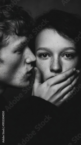 One person whispers to another while the listener covers their mouth, indicating they will not share the secret.