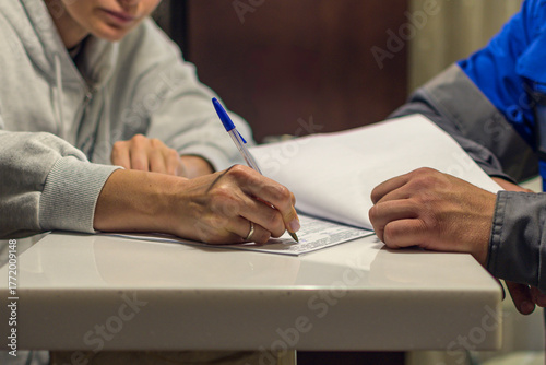 One person writes with a pen on a piece of paper, while the other person watches the process or waits for his turn to sign the document. This may involve submitting an application, samples, submitting