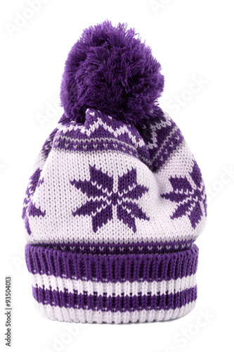 One single purple winter bobble ski knit hat with snowflake pattern isolated on white background winter clothes
