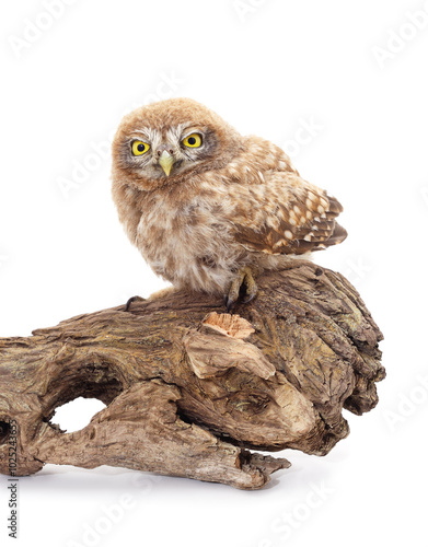 One small owl sits on the bark.