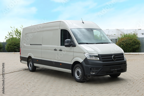 One white minibus parked on paved road outdoors
