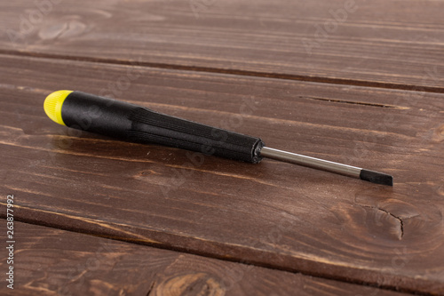 One whole screwdriver with a yellow black plastic handle work item on brown wood