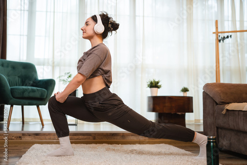 One woman training at home young adult female stretching on the floor