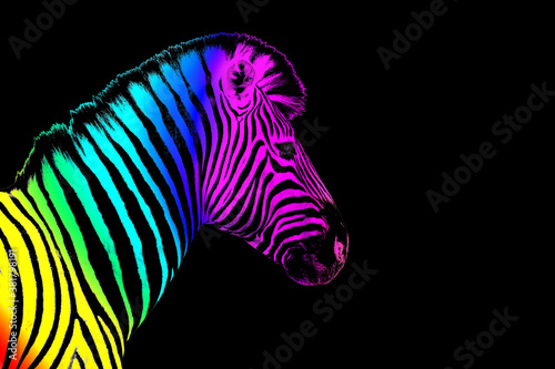 One zebra head with rainbow color striped pattern skin on black background isolated closeup side view, different concept, imagination design, individuality symbol, surreal decoration, art trendy print