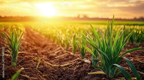 Onion plantation in the vegetable field garden agriculture in harvest season with sunset background in countryside. Onion farming concept.