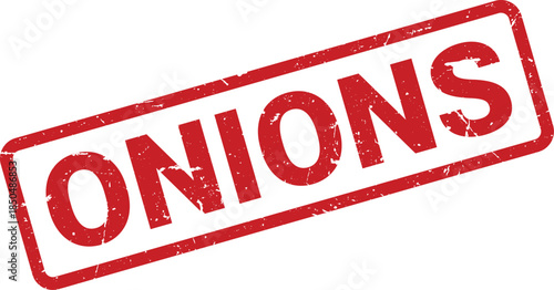 Onions Text in a Red Distressed Stamp, Isolated on White Background with Angled Position