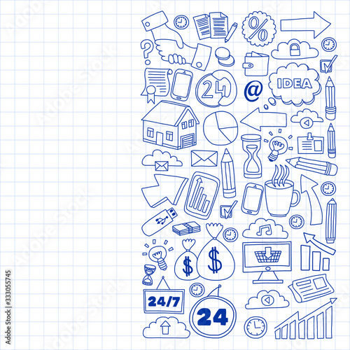 Online business and management school. Pattern with finance icons. Projects organization, risk, development. Team working, budget planning.