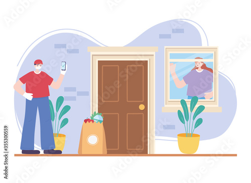 online delivery service, masked courier and smartphone grocery bag and woman in window home, fast and free transport, coronavirus covid 19