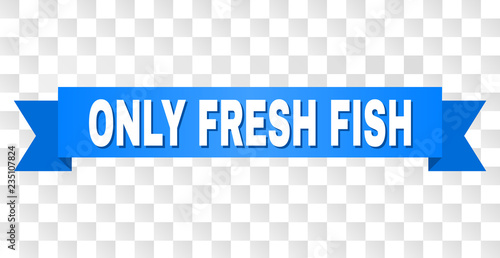ONLY FRESH FISH text on a ribbon. Designed with white title and blue tape. Vector banner with ONLY FRESH FISH tag on a transparent background.