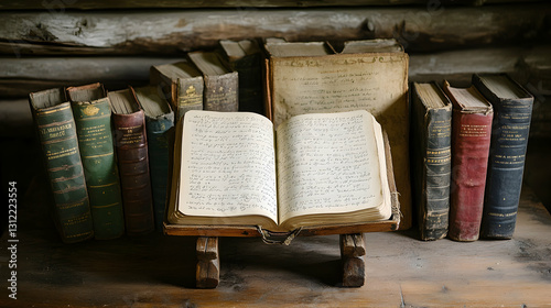 Open Antique Book on Wooden Stand Amidst Old Books