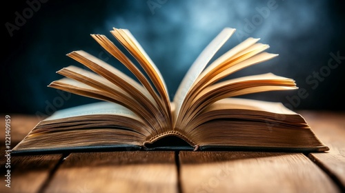 Open antique book with aged pages resting on a textured wooden surface creates a study atmosphere