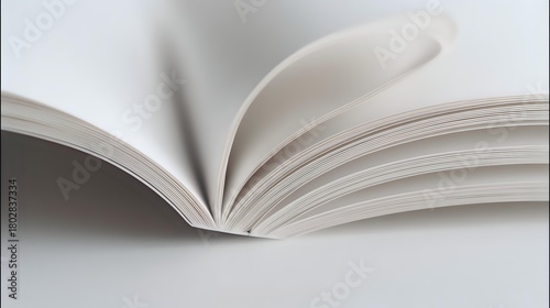 Open blank book with white pages fanning out against neutral background, showcasing paper texture and binding for publishing or education concepts.