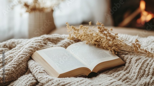Open book on a cozy blanket with a fireplace in the background warm tones and soft textures relaxing and homely vibe