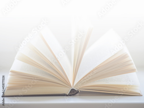 Open book on a window sill, illuminated by sunlight.