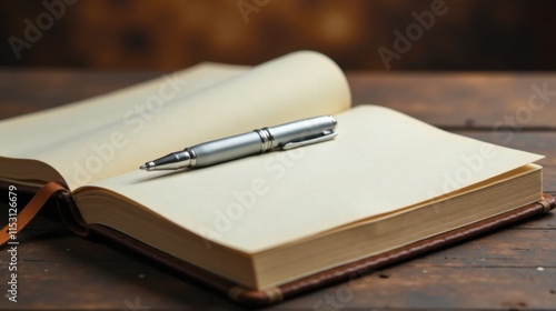 Open book with a silver pen resting on blank pages, ready for writing or sketching, inviting creative expression and thoughtful reflection on a wooden surface.