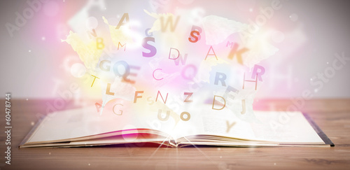 Open book with glowing letters on concrete background