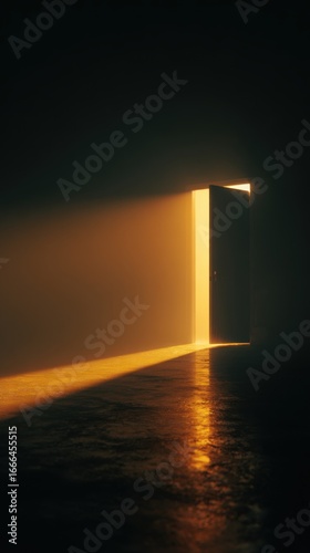 Open door in a dark room, with warm light streaming through, creating a dramatic contrast on the floor, symbolizing hope and new beginnings in a mysterious environment