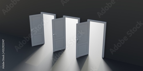 Open doors on black wall and floor. Light enter in dark room, high angle. 3d
