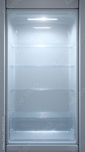 Open empty refrigerator with bright light, minimal kitchen appliance interior