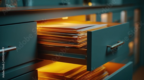 Open filing cabinet drawers filled with organized documents, warmly lit in an office setting.
