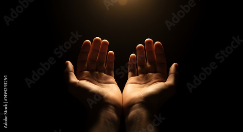 Open hands reaching upwards towards a ray of light in a dramatic black background