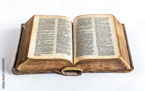 Open hardcover book with visible text and pages, placed neatly on a white background, professional studio lighting