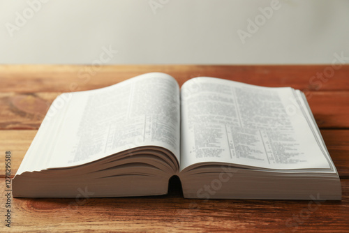 Open Holy Bible in English language on wooden table, closeup