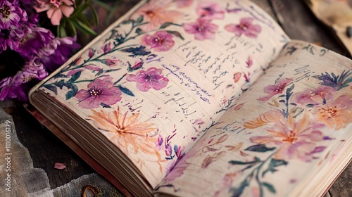 Open journal with watercolor floral illustrations and handwritten notes on aged paper.