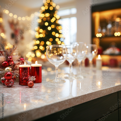 Open kitchen counter top champagne glasses ornaments. Christmas tree decorated with golden garland. Cozy homely festive atmosphere. Family holiday celebration