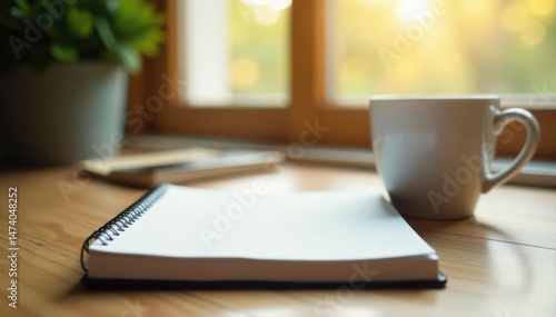 Open notebook, coffee cup, wooden surface, bright light, office, cozy, background