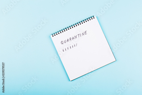 Open notebook on blue paper background, flat lay, top view. Counting days of quarantine during coronavirus covid-19 outbreak. Stay at home during pandemic, self isolation concept. Overhead