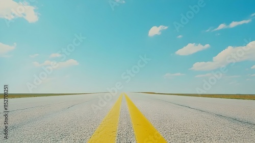Open road ahead, sunny sky, yellow lines. Endless journey concept.