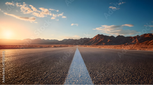 Open road leads to adventure with stunning sunset over mountain range, inspiring travel and freedom