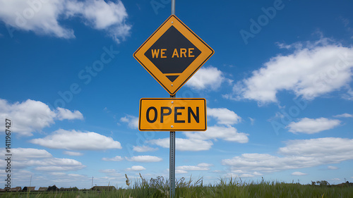 Open sign against a blue sky with clouds yellow and black text announcing a business's availability.