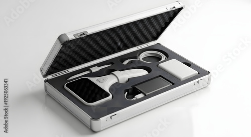 Open silver briefcase with electronic device and accessories inside foam lining metal