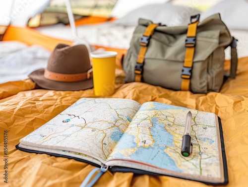 Open topographic map, pen, hat, bag, and cup inside a tent, representing a travel and adventure concept, indoors with warm lighting.