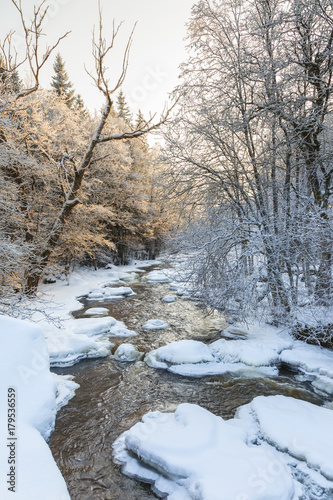 Open water in the river that flows through a winter forest