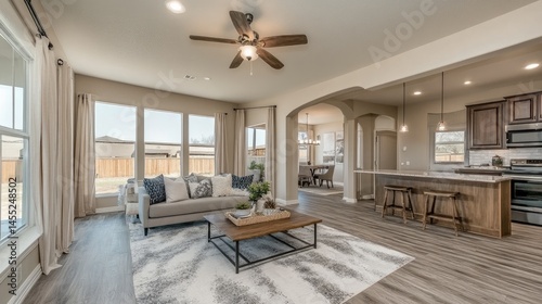 Open-concept living room with unobstructed passage leading to other rooms